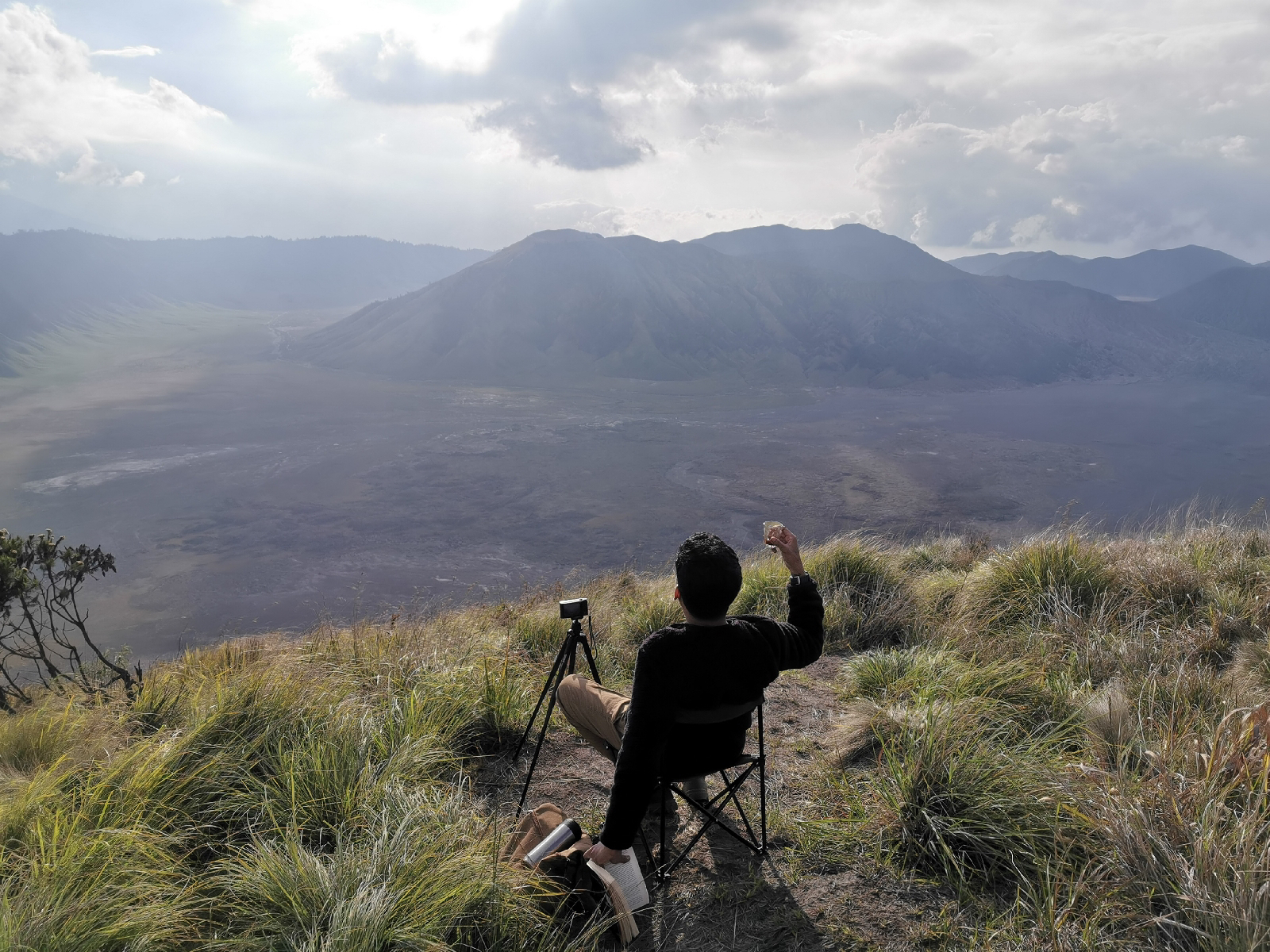 Saya menantikan momen matahari terbit di atas kursi lipat, sedikit kedinginan.